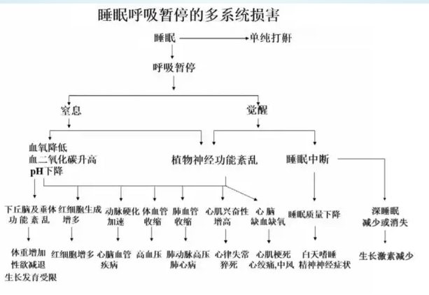 在这一过程中,患者往往因低通气、呼吸暂停而出现低氧血症,从而导致细胞缺氧,儿茶酚胺类物质分泌增多,久而久之,导致高血压的形成。另外,缺氧也可导致心、脑损害及促红细胞生成素分泌增多,使红细胞增多、血小板活性升高等,从而引发冠心病及脑血栓的形成。目前,鼾症已被列为心血管疾病的独立危险因素(图2)。再者,长期处于高分贝的“呼”声下,将有可能导致噪声性聋。因此,鼾症不仅影响您睡得好不好,还是威胁您生命健康的潜在杀手!另外,鼾症也是一大社会公害,有未婚青年因此而结婚困难;有些已婚男子的妻子因受到“呼”声的困扰而休息不好,可出现神经衰弱症状,夫妻因此分室而居者不在少数。而打“呼”男子又因本病出现性功能障碍,影响夫妻生活,甚至家庭破裂的悲剧也有时发生。